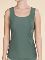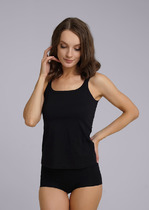 Майка из эластичного вискозного полотна. Широкая бретель. Круглая горловина. Обработка краев - открытый срез.